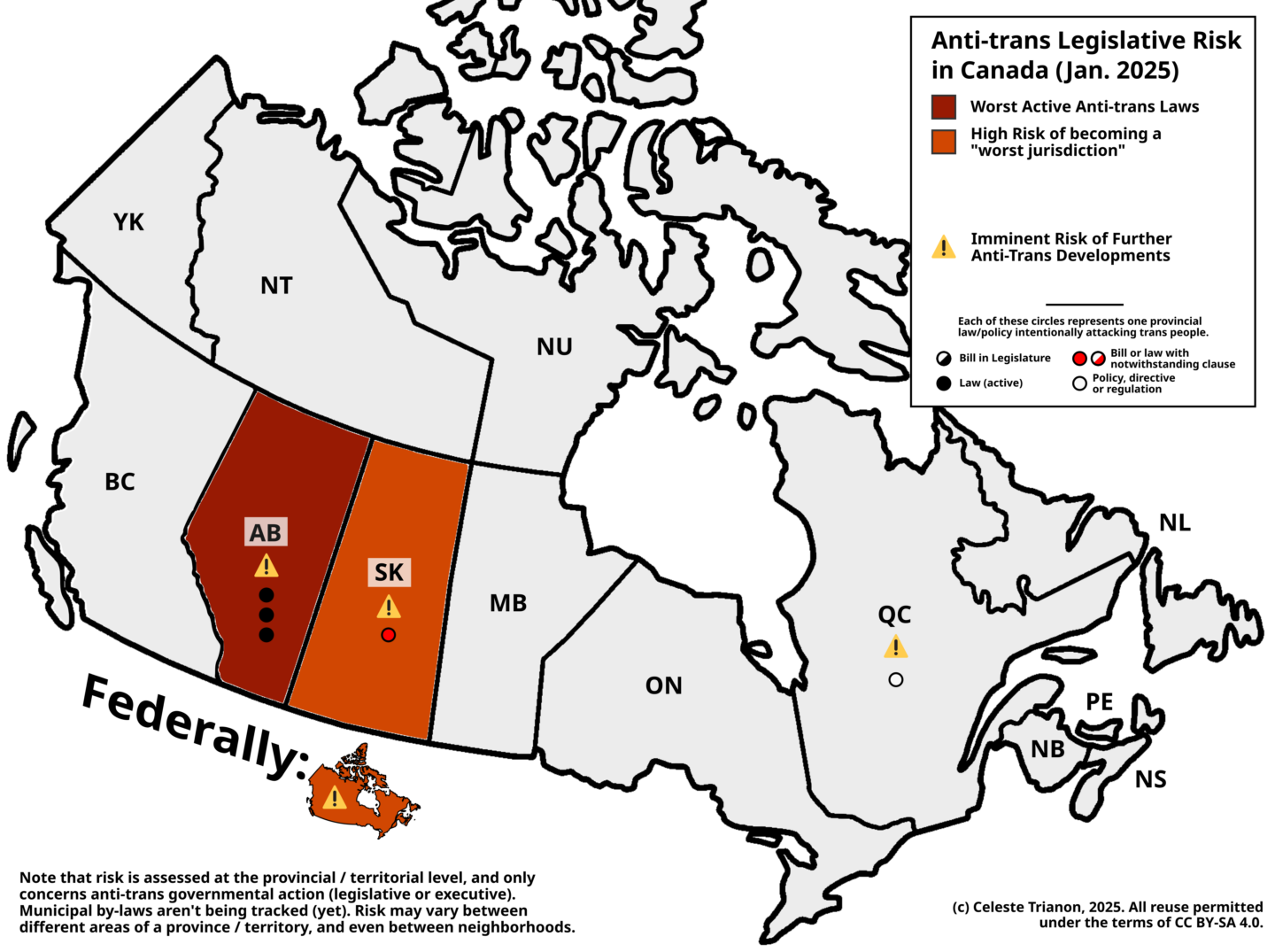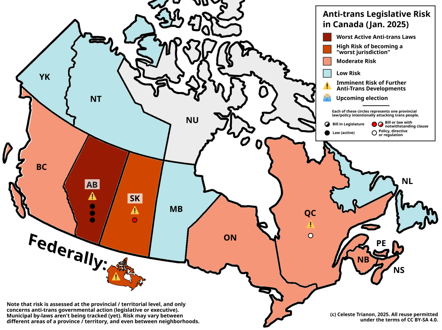 Any bill, policy, or law which actively harms a significant proportion of the trans community, or a socio-political climate favorable to making such legislation pass prior to or soon after the next elections (which encompasses, in this case, the federal Conservative Party), will bump a jurisdiction to ‘high risk’. The ‘worst anti-trans laws’ qualifier is reserved for jurisdictions which either ban gender-affirming care for trans youth, forcibly out trans youth to their parents, or otherwise has a combination of anti-trans laws and policies creating a climate so hostile to trans people that it would be analogous to a ‘worst jurisdiction’ under Erin Reed’s map.