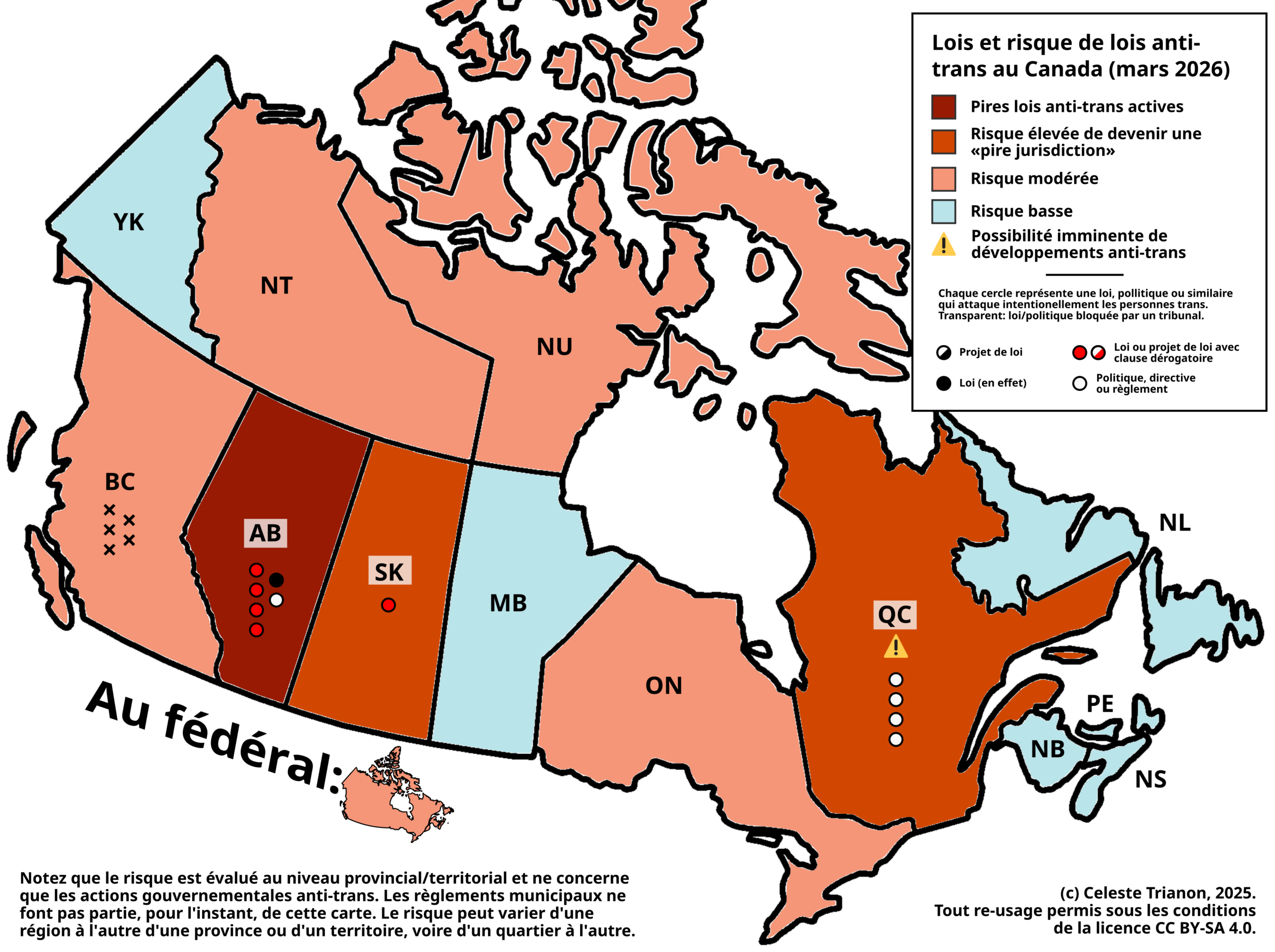 Overall, the broader context in Québec suggests that further anti-trans developments can occur anytime. As such, Québec’s risk level has been bumped up even higher. The only thing stopping Québec’s risk level from being higher than Saskatchewan is its non-use of the notwithstanding clause against trans people (though, Québec hasn’t hesitated to use it against refugees and Muslim women).